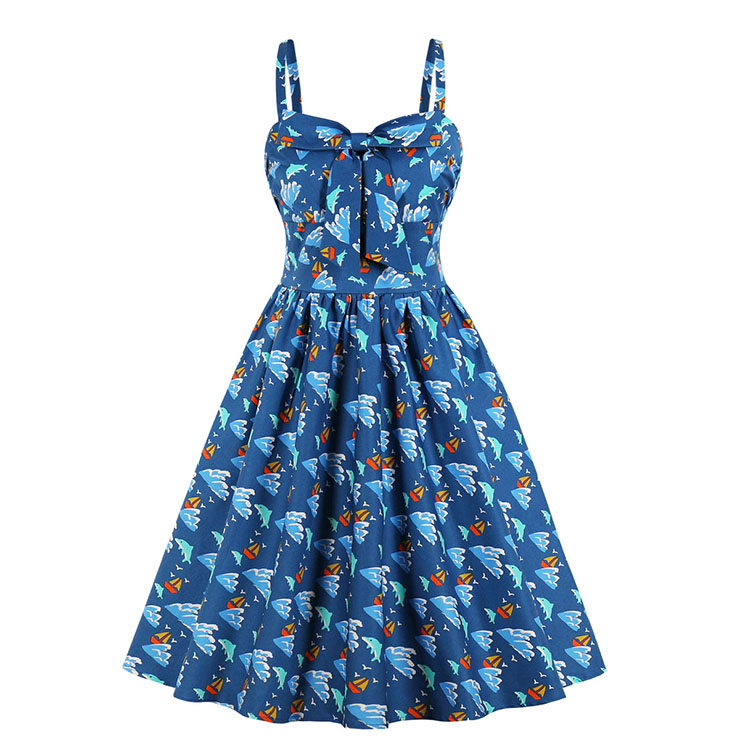 Sexy Sea Scenes Pattern Print Spaghetti Straps High Waist Dinner Party Midi Swing Dress N20566