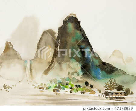 Abstract watercolor painting village riverside. - Stock Illustration [47178959] - PIXTA